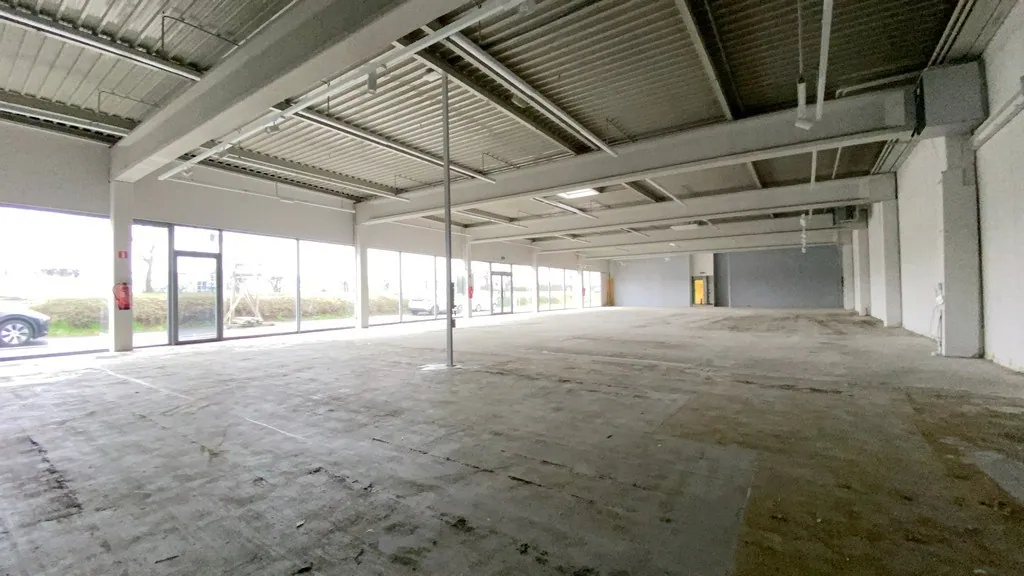 615m² showroom / winkelruimte met kitchenette, sanitair, sectionale poort, gemeenschappelijke parking (±25 parkeerplaatsen), 2 laadpunten voor elektrische wagens