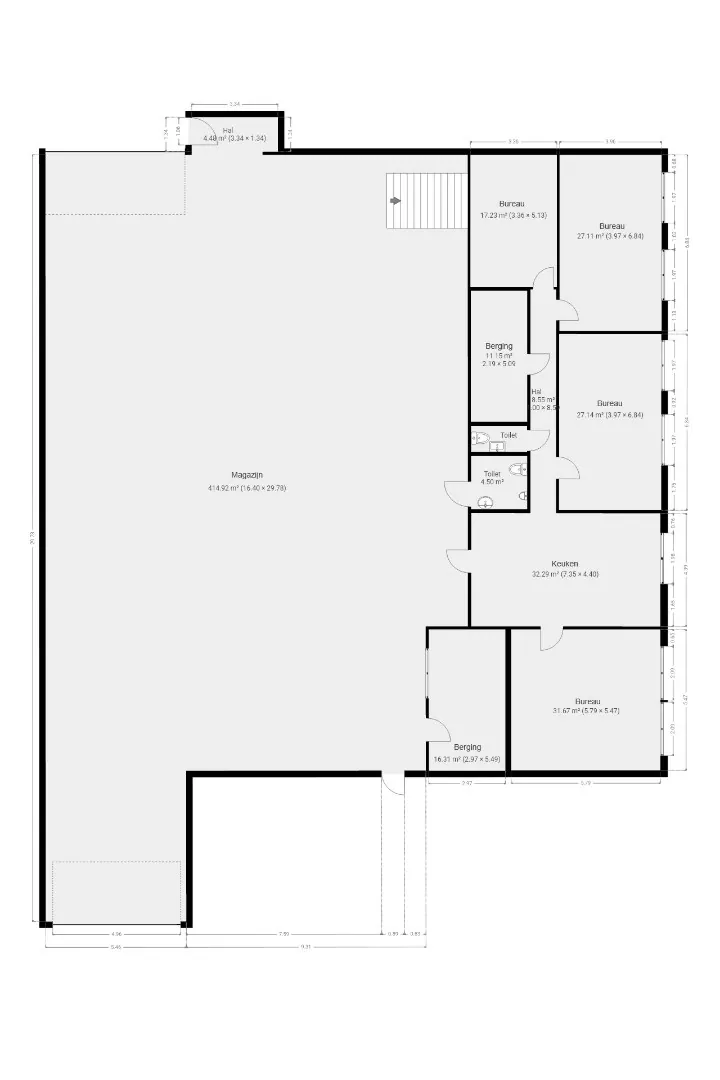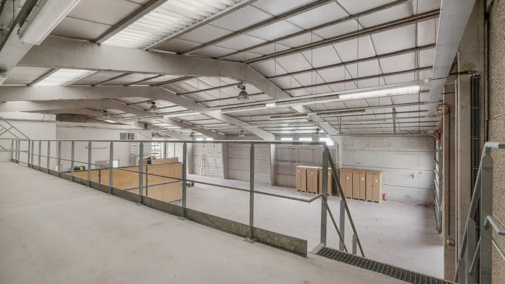 - 723m² bedrijfspand bestaande uit 415m² magazijn met 136m² mezzanine en 172m² ingerichte kantoren met keuken, vergaderzaal, burelen, berging en sanitair