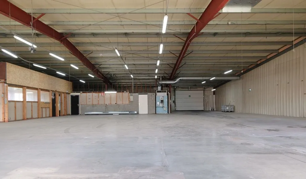 633m² magazijn met 67m² kantoor en mezzanine, kitchenette, 2 toiletten, douche en 13 bovengrondse parkeerplaatsen