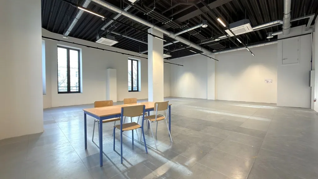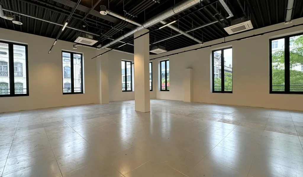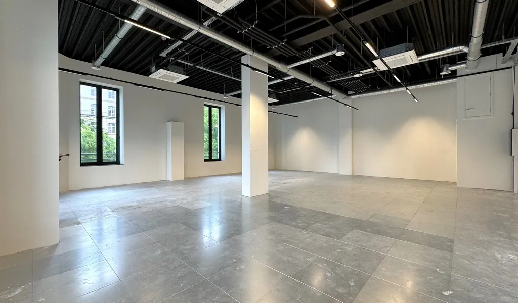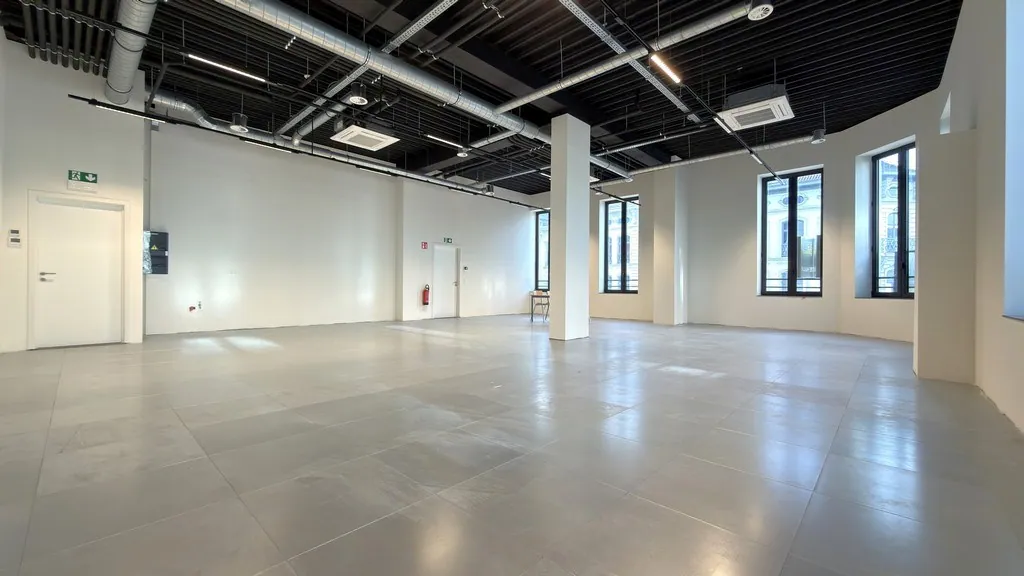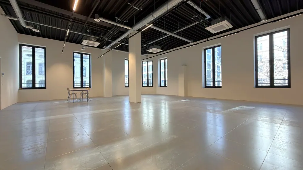 🏢 160 m² landscape kantoor met aansluiting voor een keuken en privatief sanitair. De ruimte geniet van een uitzonderlijke lichtinval en een indrukwekkende vrije hoogte van maar liefst 4,5 meter, wat zorgt voor een open en aangename werkomgeving.