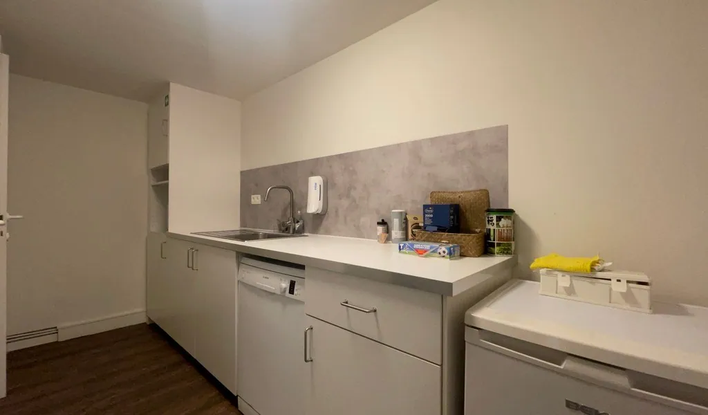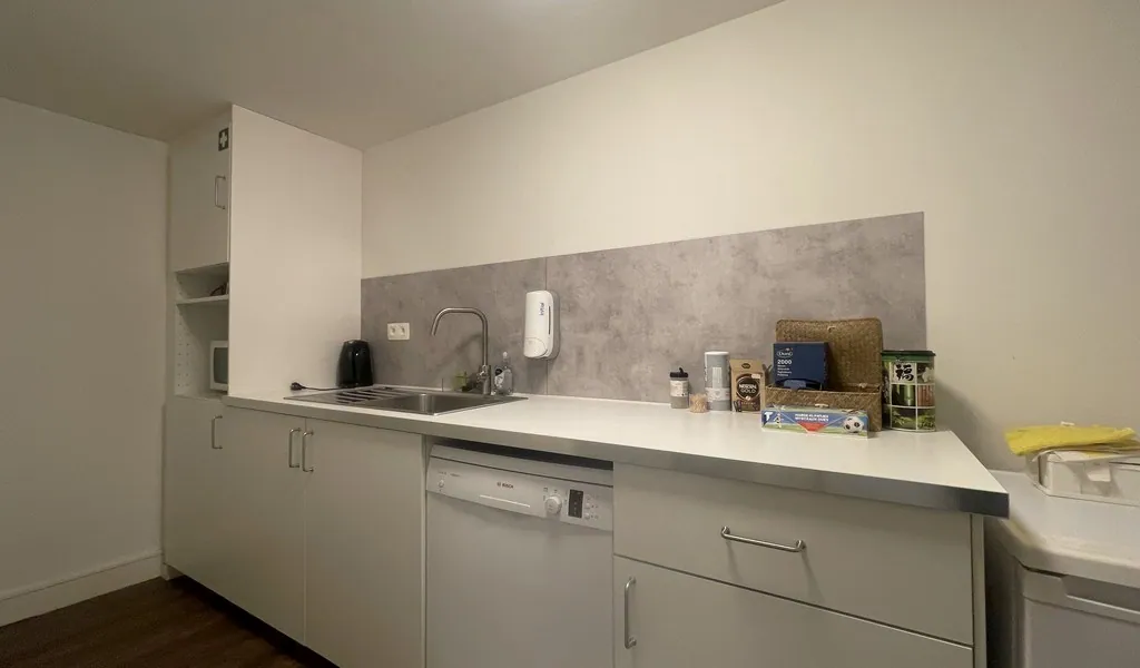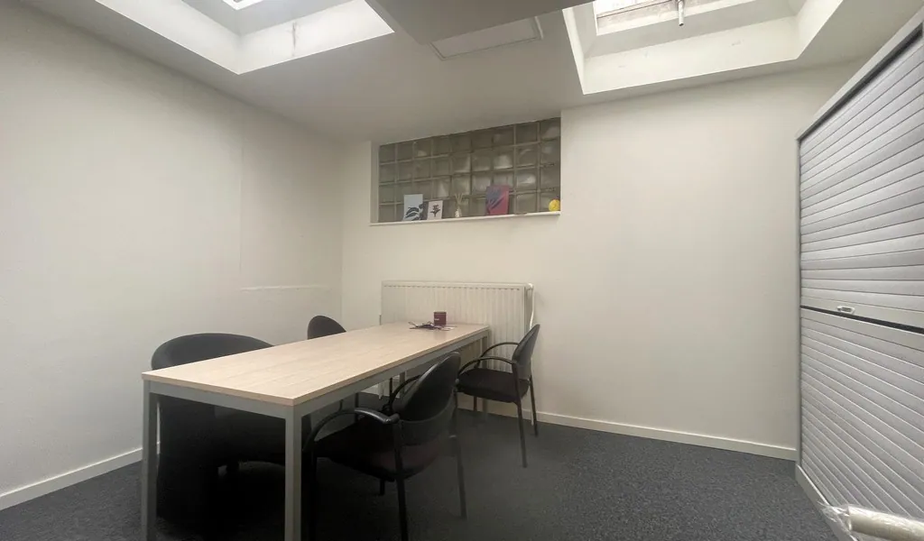 - glv: twee directe toegangen van de straatzijde tot winkel (open space) met vergaderzaal, kitchenette (9m²) en sanitair (2 toiletten)