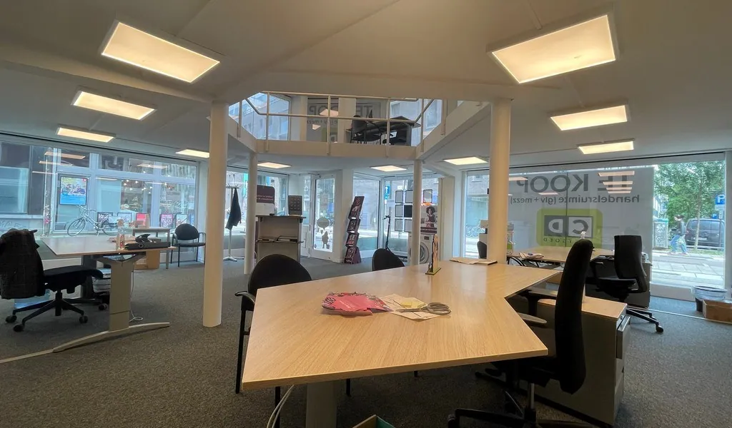 Met een totale oppervlakte van 255 m² biedt het pand alles wat jij nodig hebt om meteen aan de slag te gaan. Op het gelijkvloers vind je een open winkelruimte met twee toegangen vanaf de straat, een aparte vergaderruimte, een kitchenette en twee toiletten. De mezzanine is ingericht als ruime open work space met een extra vergaderruimte.
