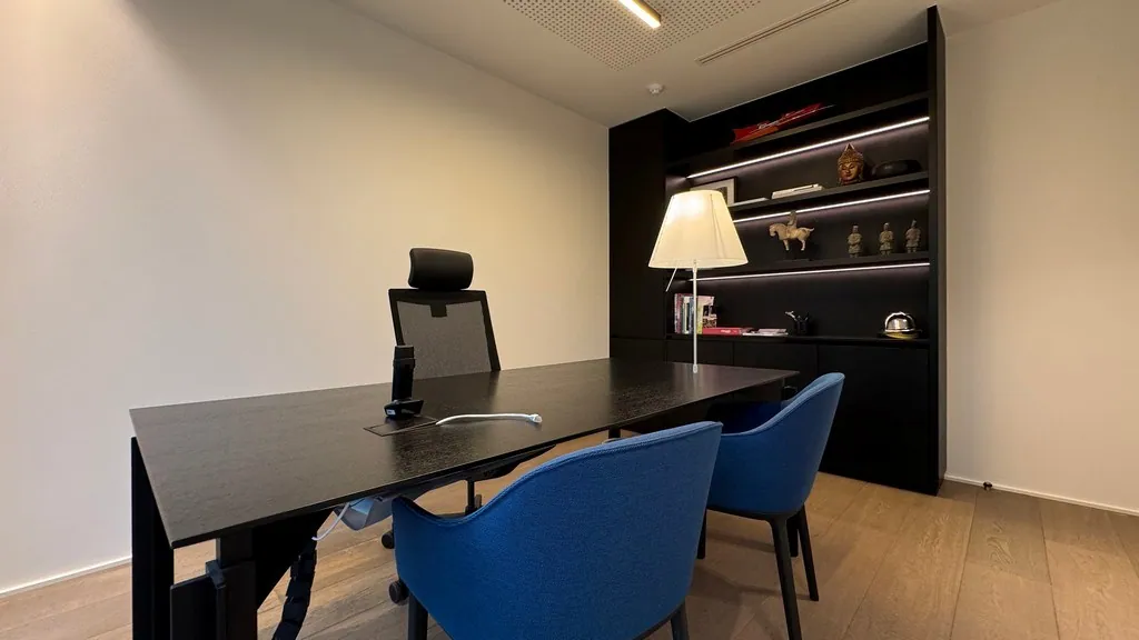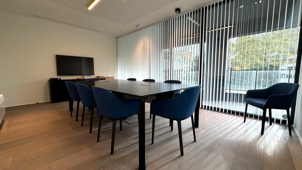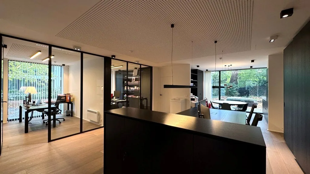 Onthaal met wachtruimte, 4 aparte burelen, grote kantoorruimte met open, ingerichte keuken (13 m²), vergaderzaal (23 m²), 1 ondergrondse garagebox, 3 ondergrondse parkeerplaatsen, 2 bovengrondse parkeerplaatsen