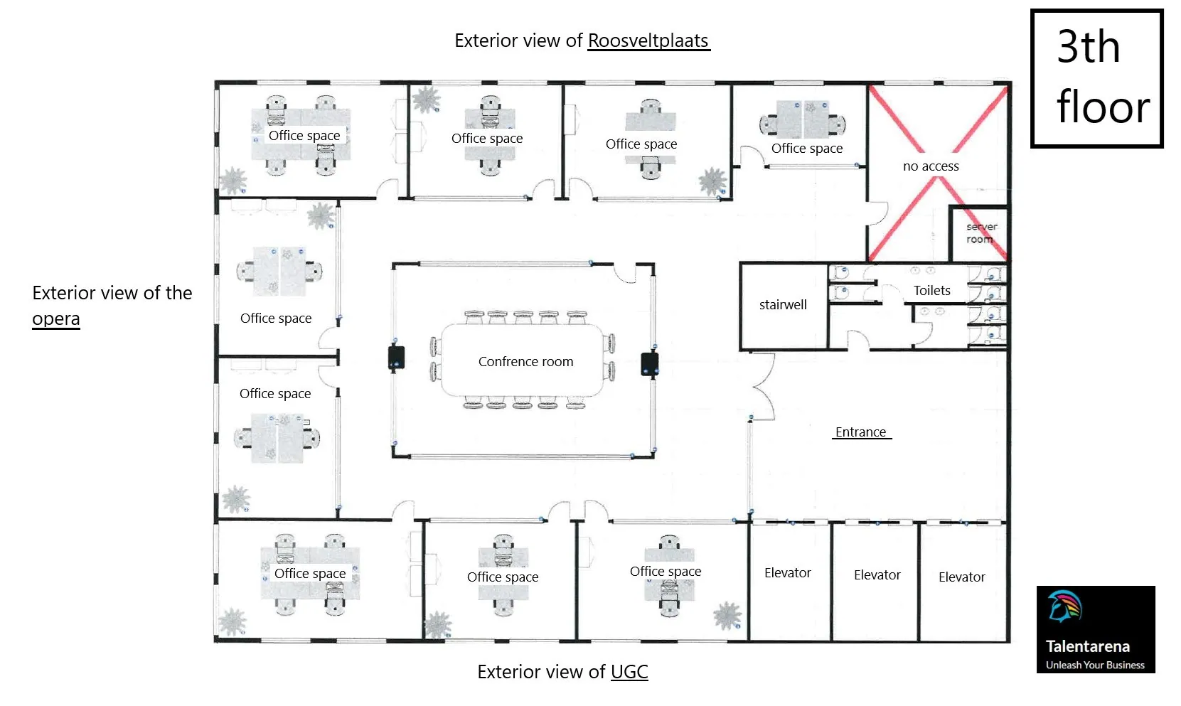 Talentarena biedt een volledig ingedeelde en instapklare kantoorruimte te huur aan op 3e verdieping van het prestigieus kantoorgebouw President Building. Het kantoor bevindt zich op een zeer centrale, goed bereikbare locatie aan de Rooseveltplaats (N12) op wandelafstand van het Centraal Station en het stadscentrum.