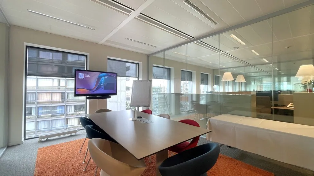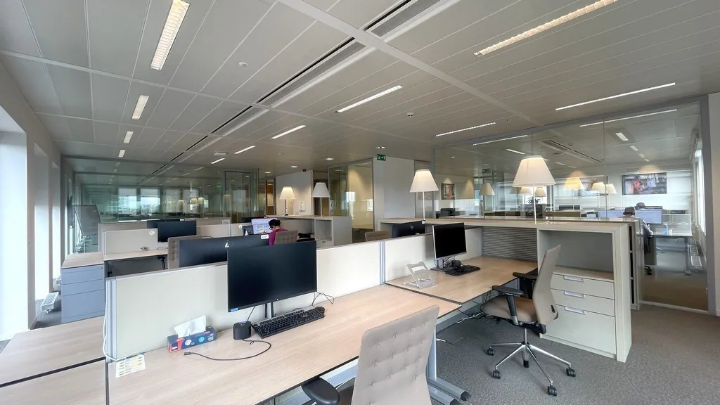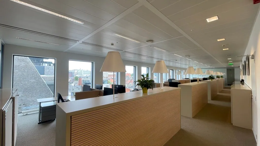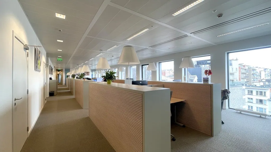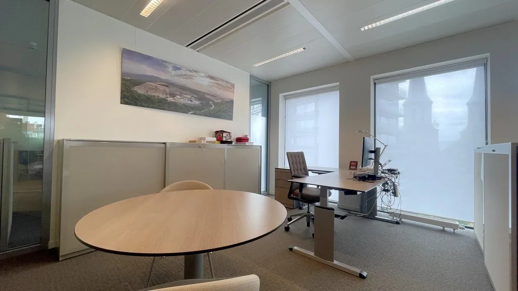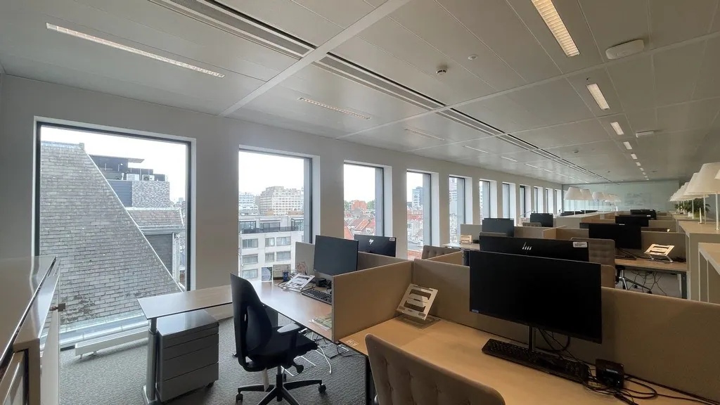 De kantoorruimte geniet van veel natuurlijke lichtinval dankzij het aluminium schrijnwerk met dubbel glas, aangevuld met buiten- en binnenzonwering. Het verlaagde plafond met inlegtegels en geïntegreerde LED-verlichting draagt bij aan een aangename werkomgeving, terwijl de verhoogde vloer met tapijttegels en ingebouwde vloercontactdozen zorgt voor maximale flexibiliteit en functionaliteit.