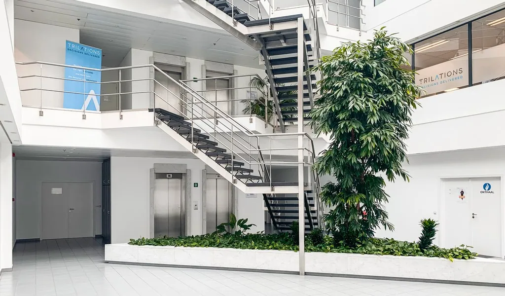 Dit kantoorgebouw bestaat uit twee aan elkaar verbonden kantoorblokken A en B met centrale inkomhal. De units in gebouw A hebben een privatieve keuken en sanitair. In gebouw B deel je deze voorzieningen.