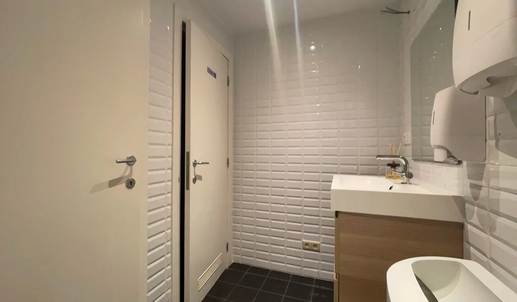 Het gebouw biedt 430 m² professioneel ingerichte kantoorruimte, verdeeld over drie verdiepingen. Op het gelijkvloers vind je een stijlvolle inkomhal, een volledig uitgeruste keuken met refter, een vergaderzaal en sanitair. De eerste verdieping beschikt over een ruime open kantoorruimte en extra vergaderruimtes. Op de tweede verdieping werk je in een lichte open space met toegang tot een privatief terras — ideaal voor informele meetings of een moment van rust.