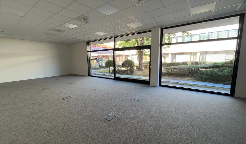 - 633m² gelijkvloers kantoor met ruime gemeenschappelijke inkom met vernieuwd onthaal, cafetaria, lockers, douches en sanitair, een privatief landschapskantoor met aparte vergaderruimte (37m²) en privatieve keuken.