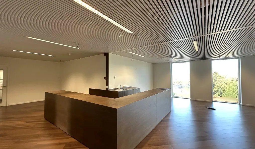 Instapklaar landschapskantoor op 3e verdieping van recent kantoorgebouw, op zichtlocatie langs E40 in de Korte Keppestraat in Erembodegem bij Aalst; vlot bereikbaar met openbaar vervoer