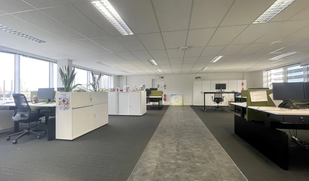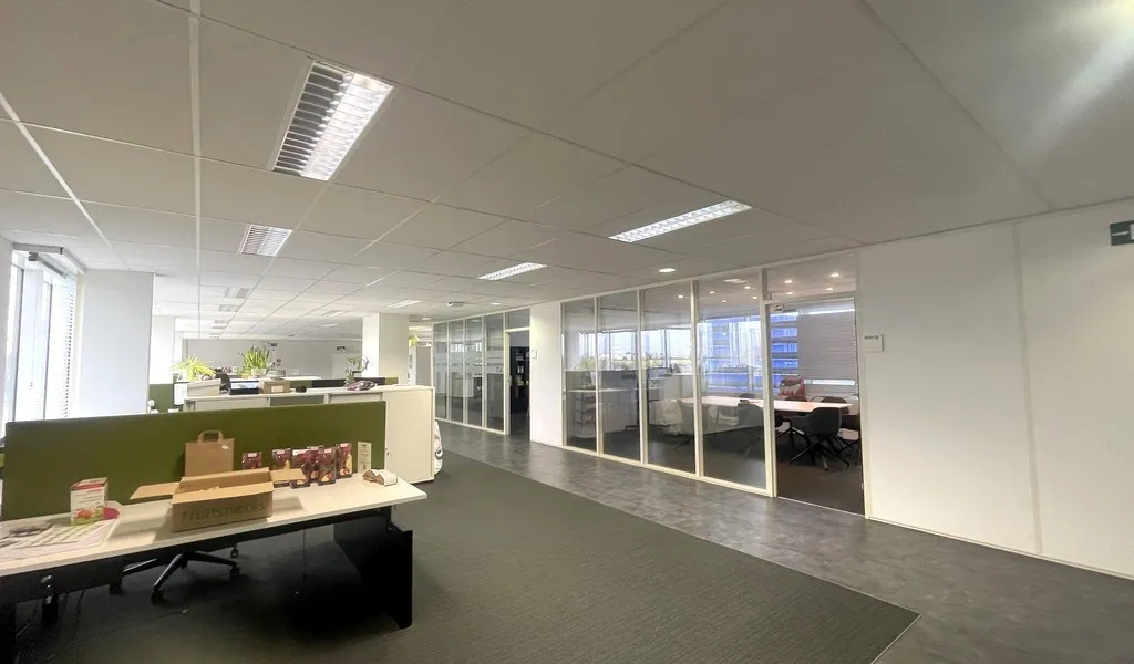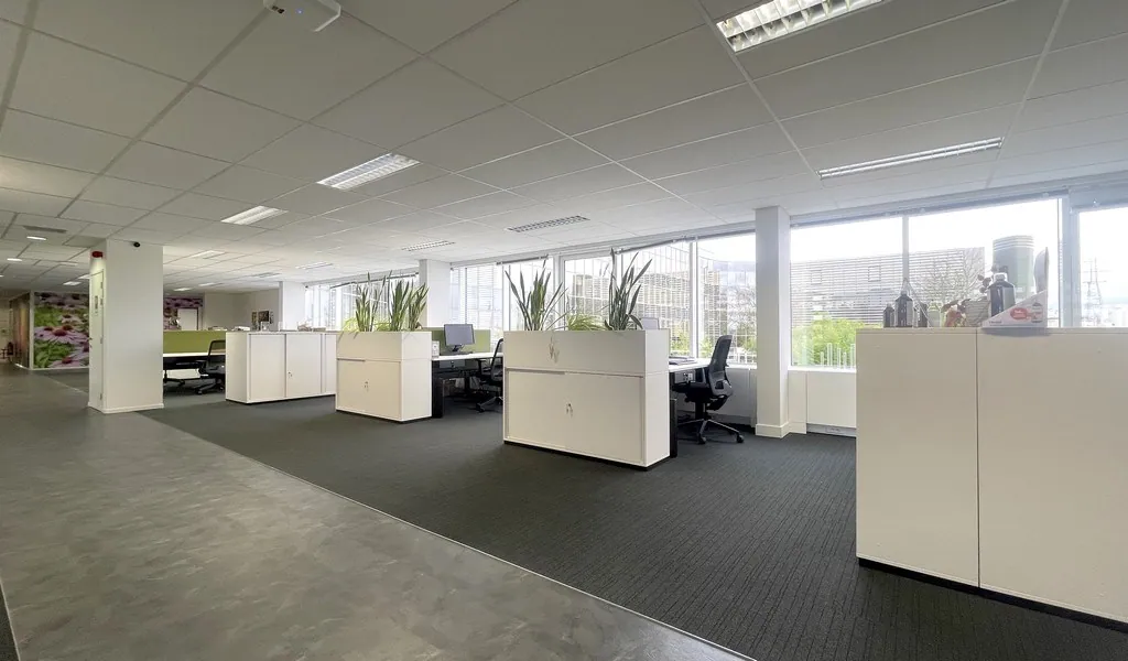 Je huurt een kantoor van 475 m², deels open landschapskantoor, deels ingedeeld, op de eerste verdieping. Dankzij de glasgevel met aluminium schrijnwerk en dubbele beglazing geniet je van veel natuurlijk licht. De kantoorruimte is voorzien van opengaande ramen, binnenzonwering, een verlaagd plafond met inlegtegels, ingebouwde verlichting, kabelgoten, vasttapijt en een eigen kitchenette met toestellen. Verwarmen en koelen gebeurt via energie-efficiënte VRV-units met spleetroosters.