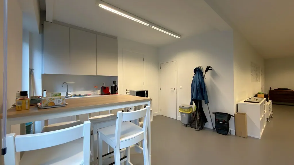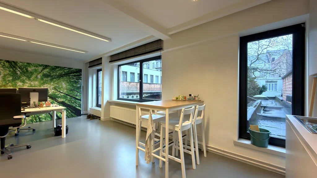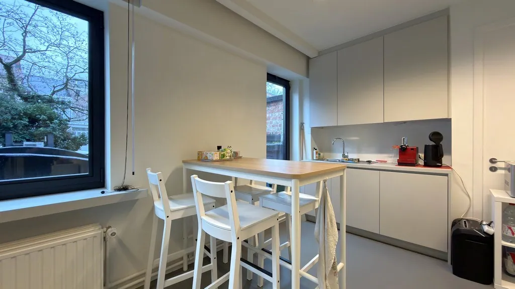 90m² kantoor met aparte vergaderruimte, kitchenette met vaatwasser, koelkast en eethoekje en privatief sanitair op de eerste verdieping