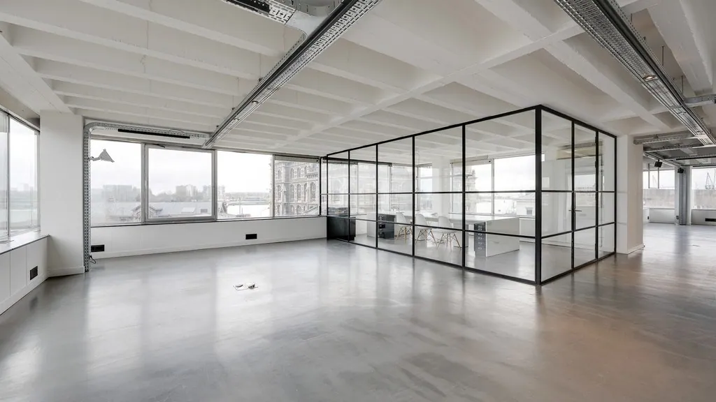 Het kantoor is ingedeeld in een ruime open werkruimte, een afzonderlijk kantoor of vergaderruimte, een privatieve kitchenette en sanitair. De industriële loftuitstraling wordt versterkt door een glasgevel, stalen schrijnwerk en een strakke gietvloer. Verder beschikt het pand over opbouwspots, databekabeling, plafondkabelgoten, cv op gas, airconditioning en aansluitingen voor Proximus en Telenet. Het gebouw is uitgerust met twee liften.