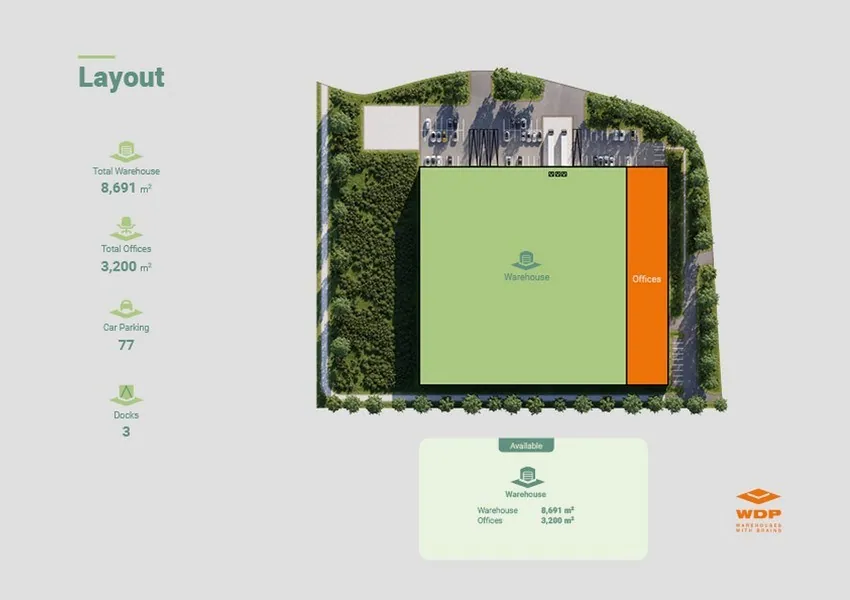 Magazijn met laadkades en kantoren te huur in industriezone Mechelen-Noord op een strategische zichtlocatie langs E19 (Antwerpen-Brussel) en vlot bereikbaar met het openbaar vervoer.