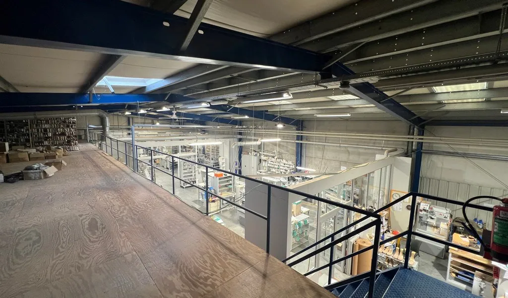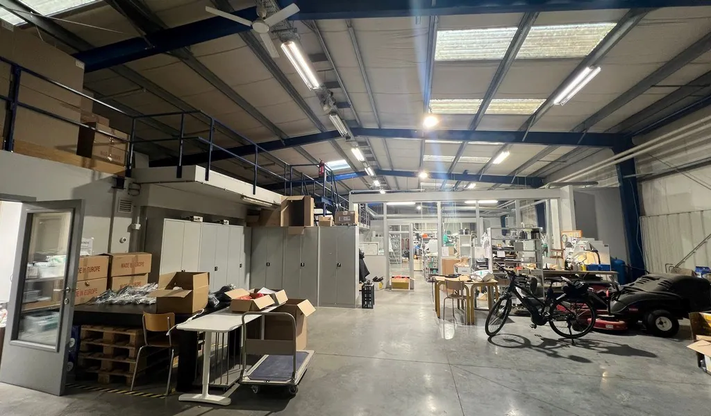 - 367m² magazijn met 217m² mezzanine en 346m² kantoorruimte (inclusief keuken, sanitair en douches) en overdekte buitenstockage met luifel (128m²)