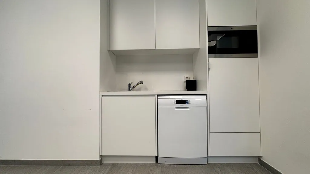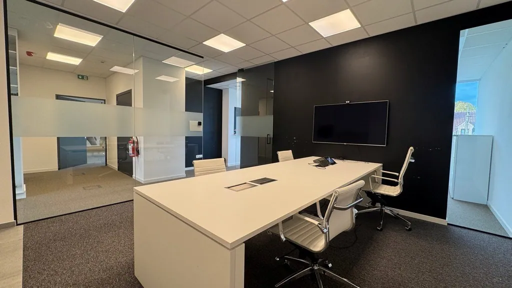 - 111m² gemeubelde kantoorruimte met vergaderzaal (23m²), kitchenette met toestellen en sanitair op de 1ste verdieping met 2 privatieve bovengrondse parkeerplaatsen