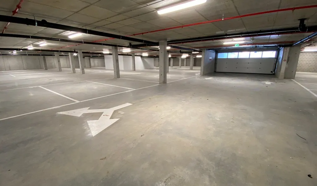 84 ondergrondse en 5 bovengrondse parkings aan €1500/ppl/jaar met nummerplaatherkenning en laadpalen en fietsenstalling met oplaadpunten: 140 fietsen