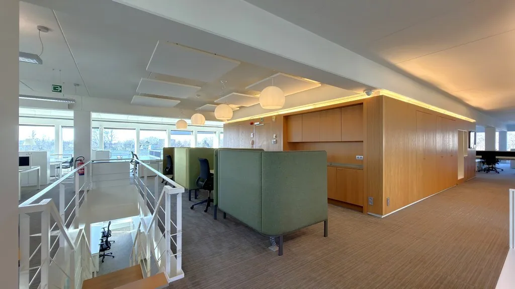 - 1.074m² hoogwaardig afgewerkt kantoor op de eerste en tweede verdieping met interne trap, deels ingedeeld met aparte vergaderruimtes en volledig uitgeruste keuken met toestellen en gemeenschappelijk sanitair